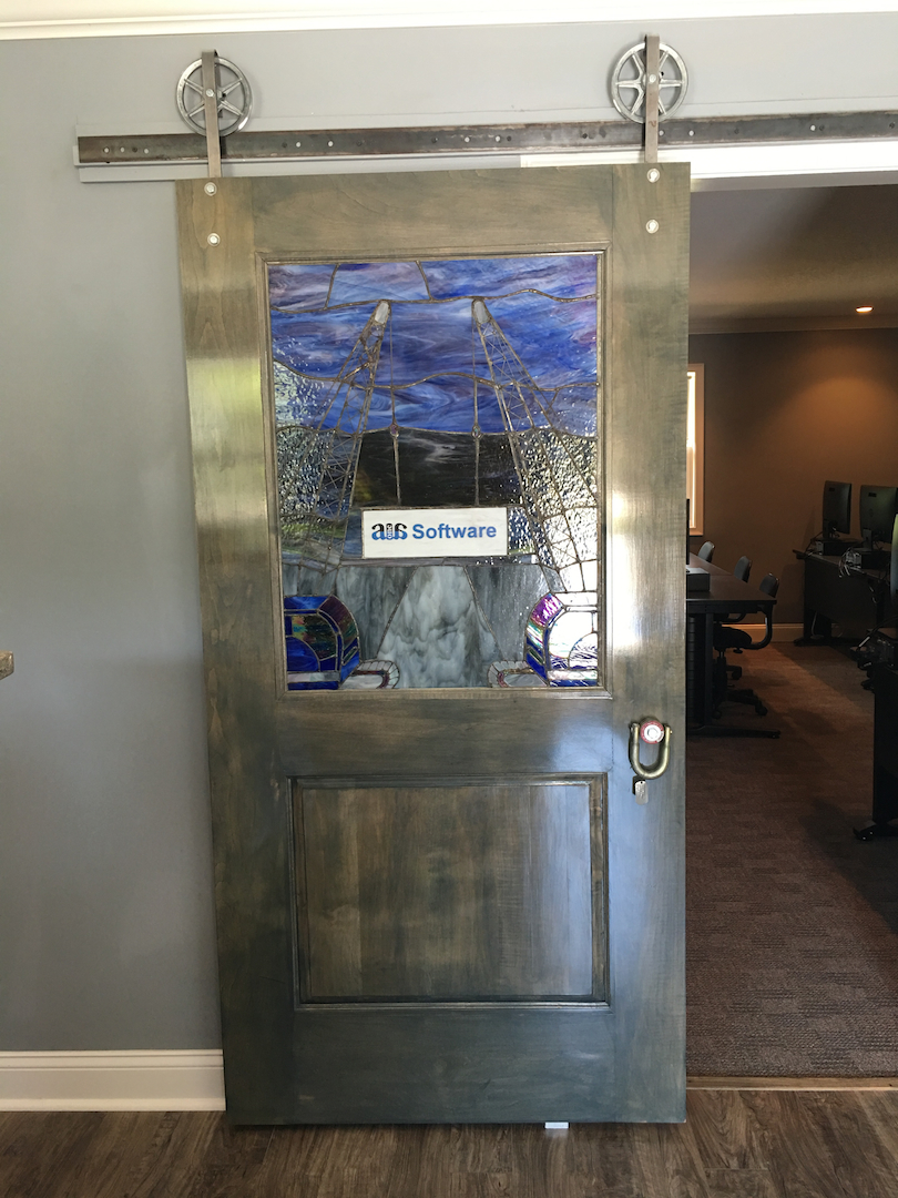 A1A Software commissioned an original stain glass from a local artist for the front door to the company’s new training center. The handle is made from a Crosby shackle.