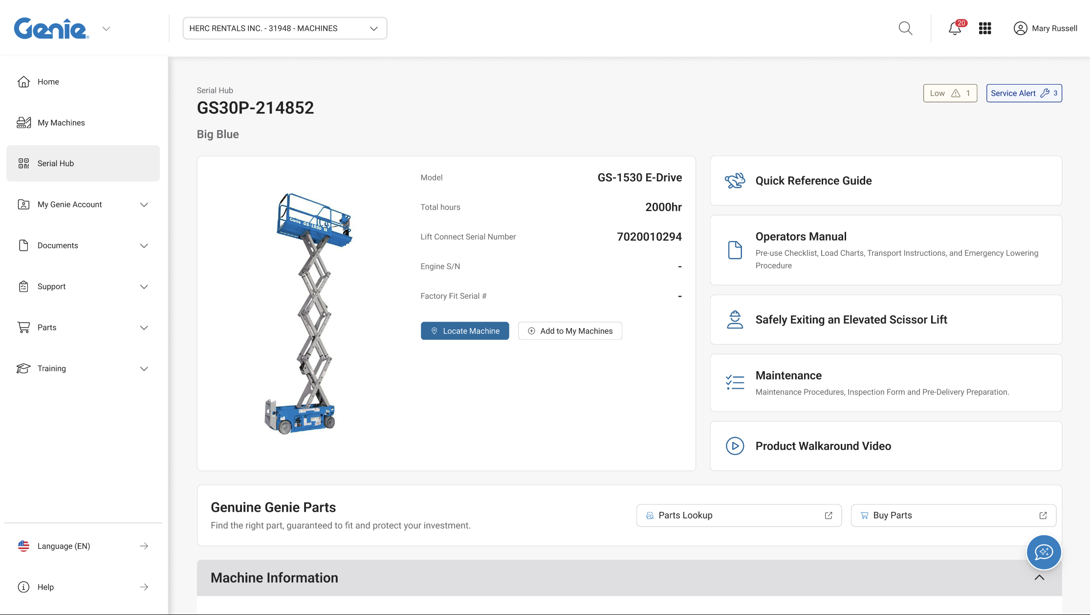 Genie Serial Hub QR Codes. Introduced in 2025, QR Code decals, included on new machines, provide equipment-specific access to documentation, service history, and troubleshooting guides. QR code decals are also available as aftermarket parts and are retrofittable to any prior generation of Genie equipment.