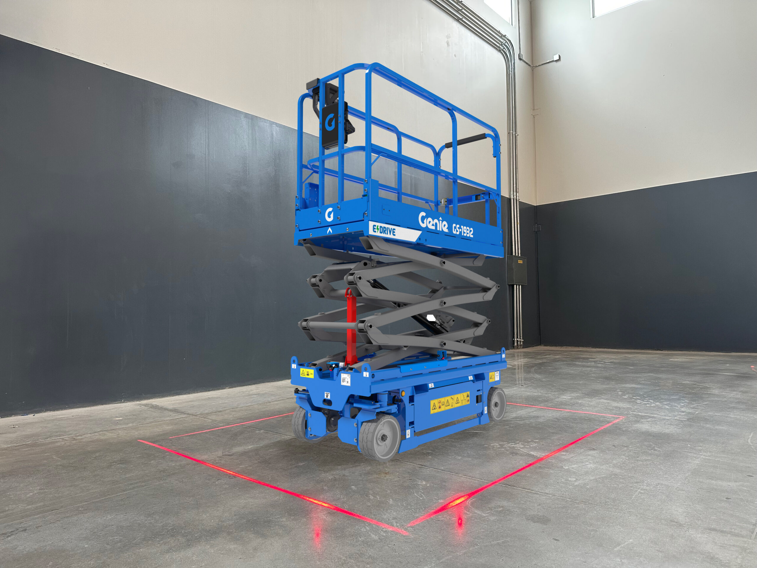 Zone Lighting increases perimeter awareness for scissor lift operators by projecting red laser boundary lines around the chassis, marking the work-zone perimeter.