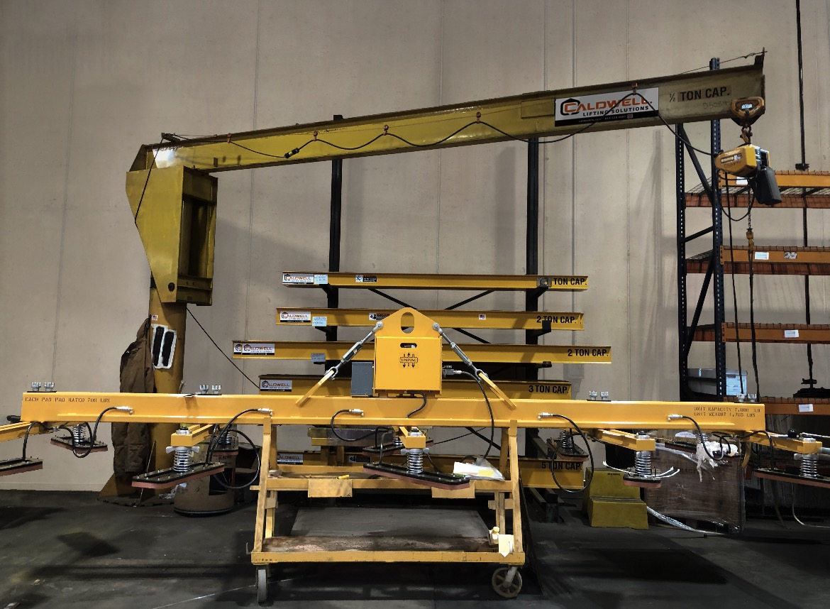 Rockford, Illinois-based Caldwell provides a variety of electric, mechanical, shop air and battery powered vacuum lifters for handling non-ferrous material that doesn’t work with magnets. In this instance, five crossarms and 10 pads were added to handle longer, wider, and heavier materials than standard models. Special rectangle pads were preferred to standard round alternatives. Certain pads can be disengaged for smaller lifts when all are not necessary.