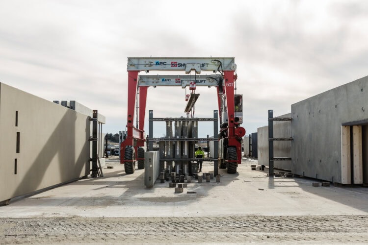 Advanced Precast Company is using a Shuttlelift DB50 rubber-tired gantry crane.